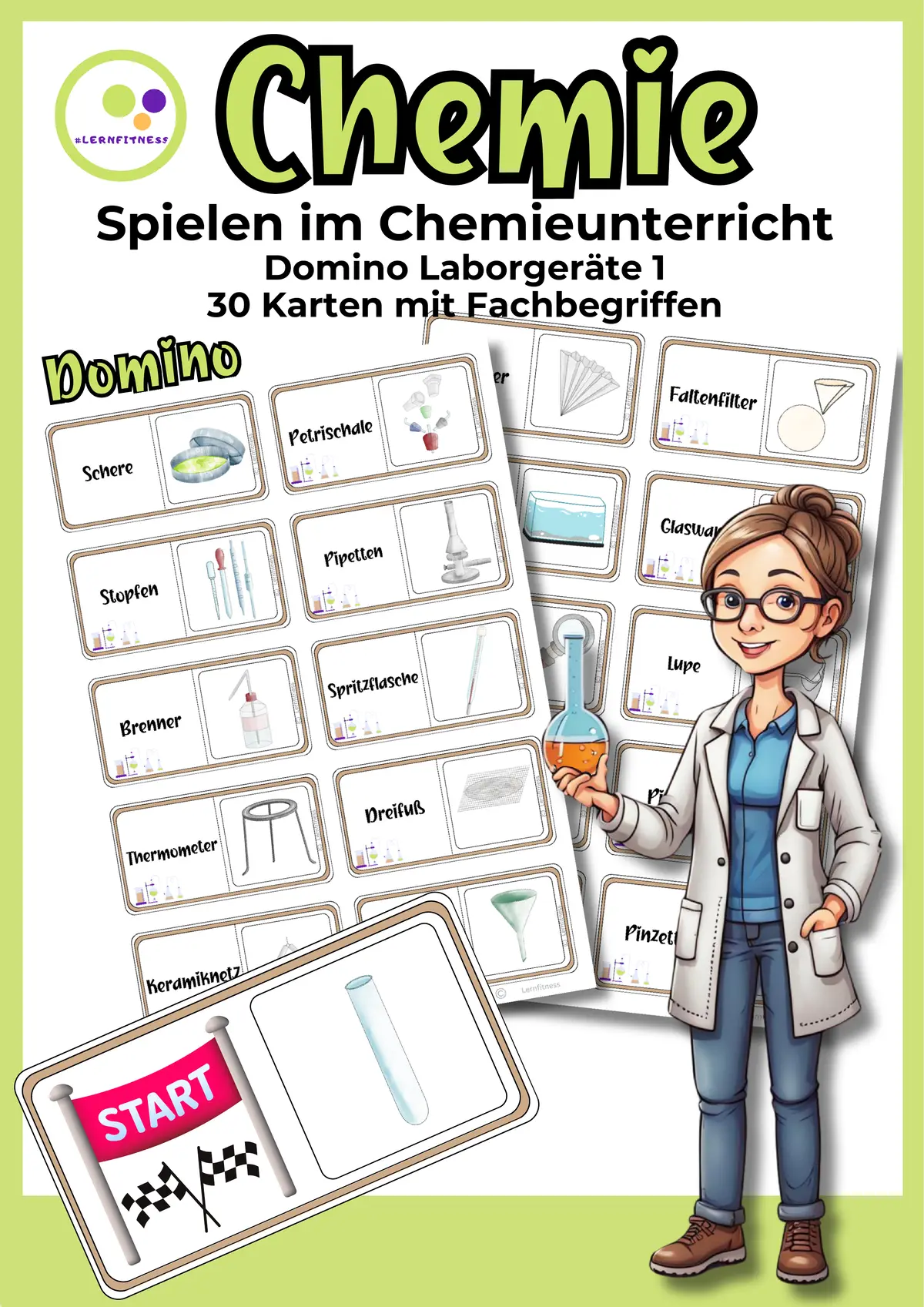 Das Domino umfasst 30 Karten mit zentralen Laborgeräten des Chemieraums, darunter: